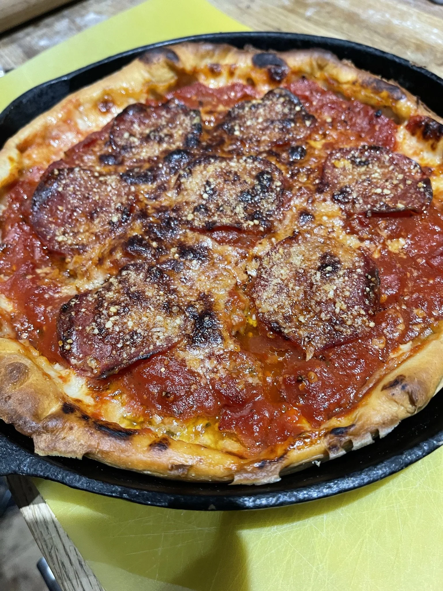 Built backwards with cheese on the bottom and sauce on top, I like to top mine with pepperoni, green peppers, red onion, and a sprinkle of parmigiana. Its baked in my mother’s old cast iron skillet, making the meal full of happy memories.